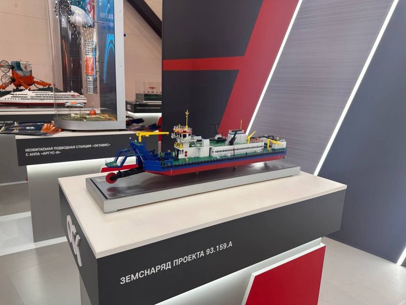 На стенде ОСК представлен макет уникального российского самоходного земснаряда проекта 93.159А. Серия из шести таких судов строится на производственной площадке АСПО Южного центра судостроения и судоремонта ОСК.