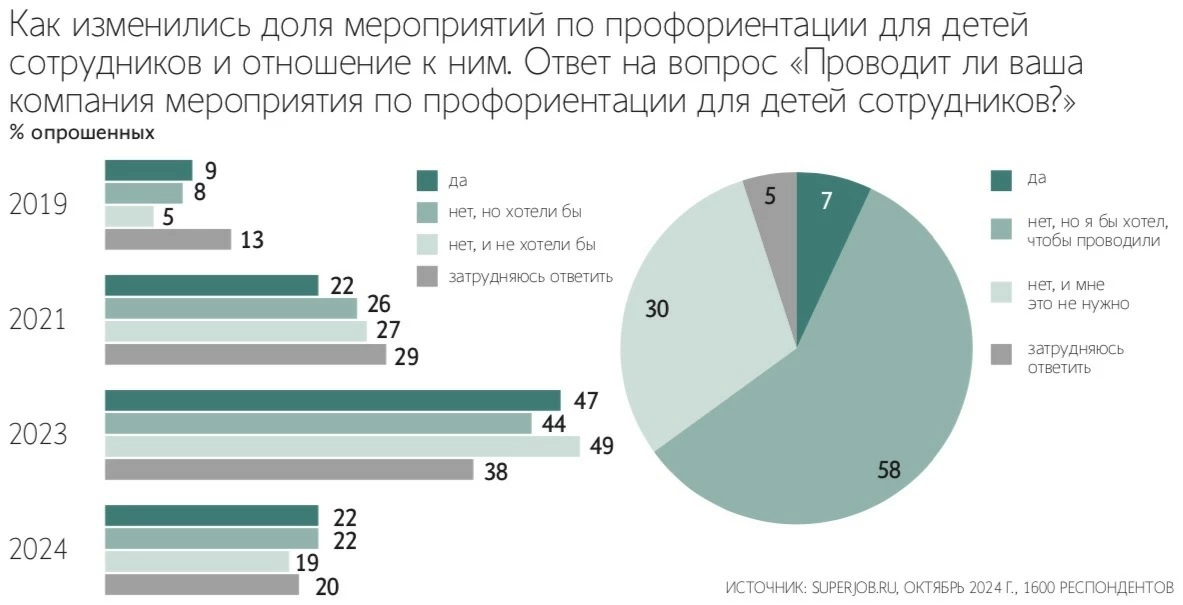 По данным SuperJob, еще в 2022–2023 гг. доля работодателей, которые организовывали профориентационные программы для детей сотрудников, была минимальной – 5%. Но к концу прошлого года интерес к таким курсам вырос втрое. В исследовании HeadHunter «Бенефиты-2024» отмечается, что предприятия – лидеры в борьбе за таланты все чаще добавляют в соцпакет опции, направленные на поддержку семей своих кадров, что тоже косвенно может свидетельствовать о развитии корпоративных инициатив для подрастающего поколения.