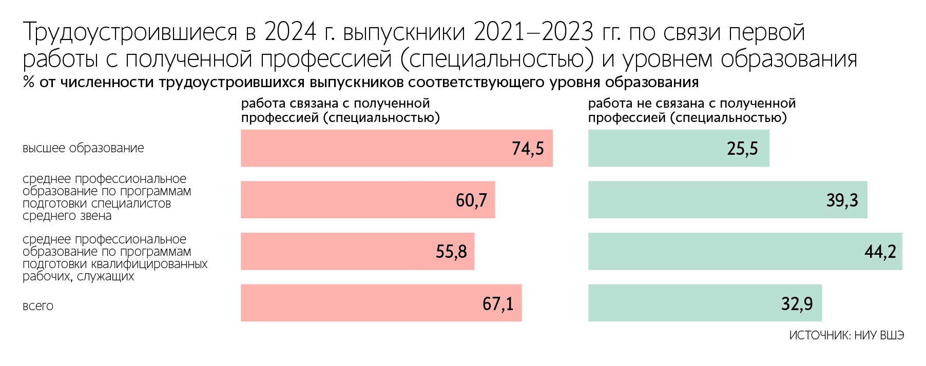 В 2024 г. почти треть (33%) выпускников 2021–2023 гг., вышедших на рынок труда, работали не по полученной специальности. Среди выпускников среднего специального образования (СПО) по программам подготовки специалистов среднего звена не по своей профессии были заняты почти 40% выпускников, среди квалифицированных рабочих и служащих – 44%, а среди выпускников вузов – 25%. Об этом говорится в статистическом сборнике «Индикаторы российского образования», который выпущен НИУ ВШЭ.