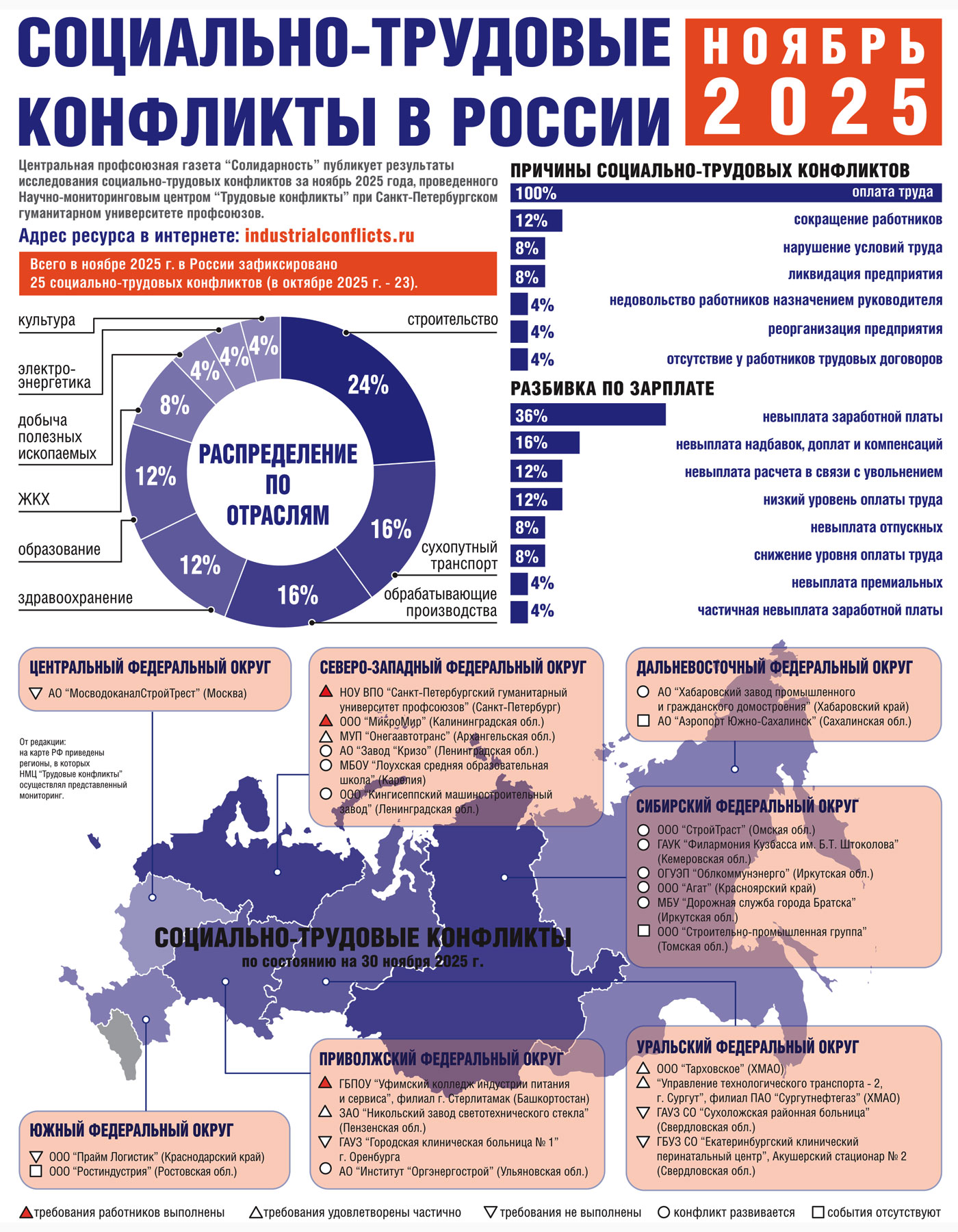 В ноябре 2025 года в России зафиксировано 25 социально-трудовых конфликтов, говорится в исследовании Центра мониторинга и анализа социально-трудовых конфликтов СПбГУП. Подробности - в инфографике "Солидарности"