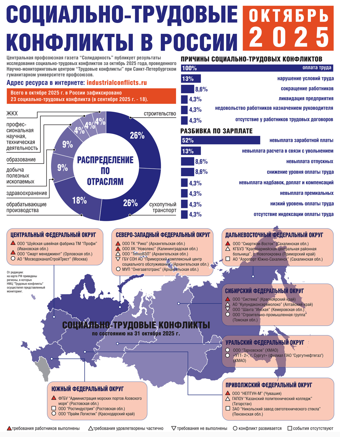 В октябре 2025 года в России зафиксировано 23 социально-трудовых конфликта, говорится в исследовании Центра мониторинга и анализа социально-трудовых конфликтов СПбГУП. Подробности - в инфографике "Солидарности".