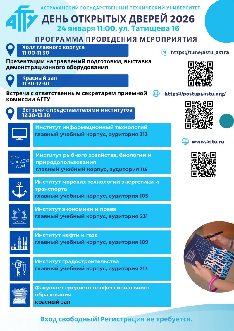 АГТУ приглашает абитуриентов и их родителей узнать всё о поступлении в 2026 году. 24 января эксперты расскажут о правилах приёма и количестве бюджетных мест, объяснят, как гарантированно поступить на бюджет и какие специальности самые востребованные.